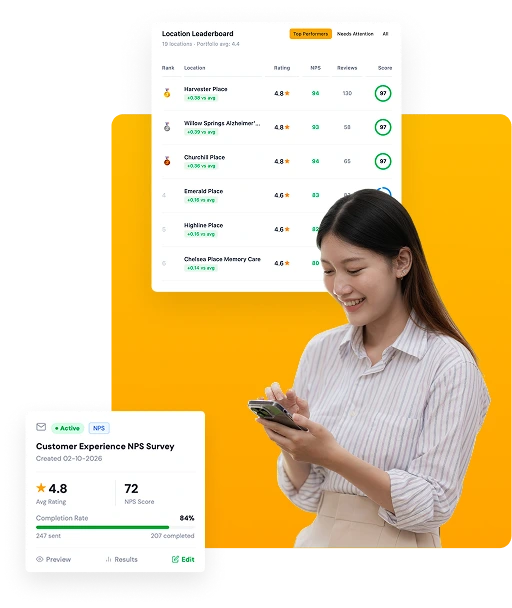 Yes. Monitor reviews, track ratings, run surveys, and compare reputation performance across every location from a single dashboard. Identify which facilities need attention and which are earning five-star reviews consistently.